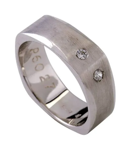 Bijelo zlato sa dva kamena. Širina prstena je 6,5 mm, a promjer kamena 1,8 mm. Moguća je izrada u žutoj ili crvenoj boji zlata sa ili bez kamenova. Kamen može biti cirkon ili dijamant. Cijena na upit.