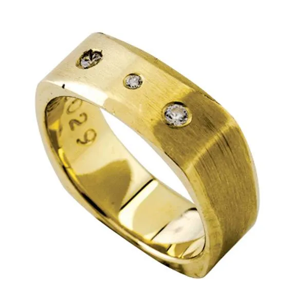Žuto zlato sa tri kamena. Širina prstena je 6,5 mm, a promjer kamenja: 2x1,8mm 1x1,3mm. Moguća je izrada u bijeloj ili crvenoj boji zlata sa ili bez kamenova. Kamen može biti cirkon ili dijamant. Cijena na upit.