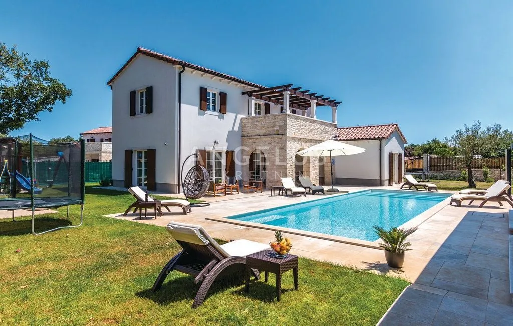 Na posjedu velcine 1330 m2 smjestena je ova prekrasna kuca za odmor. Eksterijer je izgradjen prema istarskoj kamenoj arhitekturi dok je interijer moderan i prepun zaigranih detalja. Prizemlje kuce sastoji se od kuhinje, blagovaone i velikog dnevnog boravka s izlazom na terasu, 2 spavace sobe i 2 kupaovnice. Na katu su 2 spavace sobe s kupaovnice smjestene.