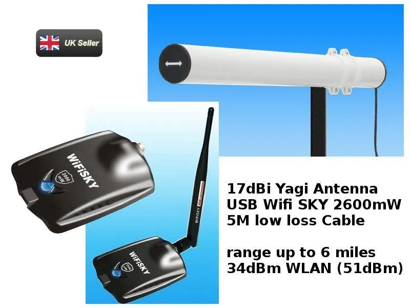 Vrlo jaka dalekometna antena 17dB (pravih) zajedno s antenom i pojačalom omogućava vam spajanje na bilo koju Wifi mrežu od nekoliko kilometara.
