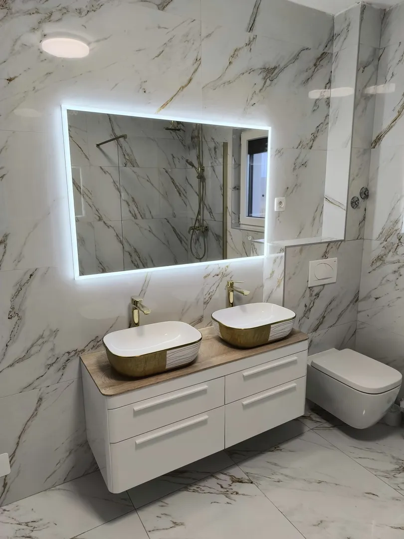 - Kupaone opremljene pločicama I klase, sa modernim namještajem, duplim umivaonicima, visećim toaletnim školjkama, ugradbenim vodokotlićem, walk in staklenom stijenom.