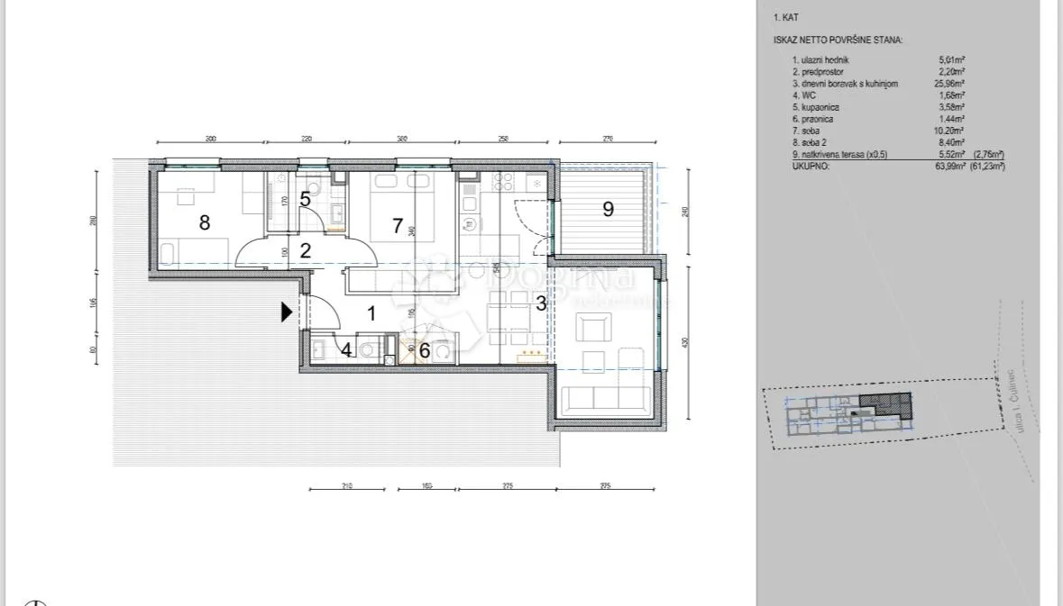 Predstavljamo ekskluzivni stambeni projekt u početnoj fazi izgradnje, čiji je završetak predviđen za zimu 2026. godine. Stanovi su projektirani kako bi spojili modernu tehnologiju, vrhunsku gradnju i maksimalnu funkcionalnost, čineći ih idealnim izborom za obitelj ili sigurnu dugoročnu investiciju. ISKAZ NETO POVRŠINE STANA: 1. ulazni hodnik 5,01m2 2. predprostor 2.20m2 3. dnevni boravak s kuhinjom 25,96m2 4. WC 1,68m2 5. kupaonica 3,58 m2 6. praonica 1,44m2 7. soba 10,20m2 8. soba 2 8,40m2 9. natkrivena terasa (x0,5) 5,52m2 UKUPNO: 63,99 M2 (61,23m2) Svaki stan opremljen je podnim grijanjem putem dizalice topline Vaillant s termostatima u svakoj prostoriji, klimatizacijom i kupaonicama opremljenim sanitarnim elementima brenda Armal, uz dodatne radijatore za optimalnu toplinu. Podne obloge čine parketi prilagođeni podnom grijanju i keramičke pločice visoke kvalitete. Ugrađena je PVC stolarija antracit boje s troslojnim IZO staklima i komarnicima, velike staklene stijene koje propuštaju obilje prirodne svjetlosti, drvena unutarnja stolarija, pregradni zidovi izvedeni u knauf sustavu, protuprovalna vrata marke Kolnoa i elegantne Vimar Neve utičnice. Projekt je zamišljen s naglaskom na energetsku učinkovitost, predviđen je energetski razred A, što osigurava smanjene troškove grijanja i hlađenja, ali i ugodnu unutarnju klimu tijekom cijele godine. Vanjski prostor obuhvaća kvalitetnu toplinsku izolaciju fasade (15 cm stiropora i mineralna vuna), kaskadne Betafence ograde, videoportafone i videonadzor marke Hikvision, uređeno parkiralište s rasvjetom, rampu na ulazu u posjed te pripremu za punjenje električnih vozila. Stanovi se nalaze u neposrednoj blizini svih sadržaja potrebnih za udoban svakodnevni život, uključujući vrtiće, osnovne škole, trgovine, zdravstvene ustanove i javni prijevoz, uključujući autobus i vlak. Ovo je rijetka prilika koja spaja modernu gradnju, luksuz, energetsku učinkovitost i funkcionalnost, pružajući idealan dom za obitelj, ali i pouzdanu dugoročnu investiciju. Ne propustite priliku i saznajte više informacija već danas. Parking nije uključen u cijenu. Za razgled nazvati: Sanja Ljubas 099 856 0887 ID KOD AGENCIJE: ZG87332 Sanja Ljubas Asistent u posredovanju Mob: 099/856-0887 Tel: 01/211-0039 E-mail: sanja.ljubas@dogma-nekretnine.com www.dogma-zagreb.com