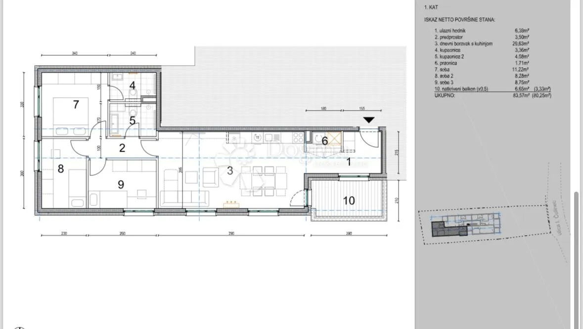 Predstavljamo ekskluzivni stambeni projekt u početnoj fazi izgradnje, čiji je završetak predviđen za zimu 2026. godine. Stanovi su projektirani kako bi spojili modernu tehnologiju, vrhunsku gradnju i maksimalnu funkcionalnost, čineći ih idealnim izborom za obitelj ili sigurnu dugoročnu investiciju. ISKAZ NETO POVRŠINE STANA: 1. ulazni hodnik 6,39m2 2. predprostor 3,50m2 3. dnevni boravak s kuhinjom 29,36m2 4. kupaonica 1 3,36m2 5. kupaonica 2 4,08m2 6. praonica 1,71m2 7. soba 1 11,22m2 8. soba 2 8,28m2 9. soba 3 8,75m2 10. natkriveni balkon x0,5 6,65m2 (3,33m2) UKUPNO = 83,57m2 (80,25m2) Svaki stan opremljen je podnim grijanjem putem dizalice topline Vaillant s termostatima u svakoj prostoriji, klimatizacijom i kupaonicama opremljenim sanitarnim elementima brenda Armal, uz dodatne radijatore za optimalnu toplinu. Podne obloge čine parketi prilagođeni podnom grijanju i keramičke pločice visoke kvalitete. Ugrađena je PVC stolarija antracit boje s troslojnim IZO staklima i komarnicima, velike staklene stijene koje propuštaju obilje prirodne svjetlosti, drvena unutarnja stolarija, pregradni zidovi izvedeni u knauf sustavu, protuprovalna vrata marke Kolnoa i elegantne Vimar Neve utičnice. Projekt je zamišljen s naglaskom na energetsku učinkovitost, predviđen je energetski razred A, što osigurava smanjene troškove grijanja i hlađenja, ali i ugodnu unutarnju klimu tijekom cijele godine. Vanjski prostor obuhvaća kvalitetnu toplinsku izolaciju fasade (15 cm stiropora i mineralna vuna), kaskadne Betafence ograde, videoportafone i videonadzor marke Hikvision, uređeno parkiralište s rasvjetom, rampu na ulazu u posjed te pripremu za punjenje električnih vozila. Stanovi se nalaze u neposrednoj blizini svih sadržaja potrebnih za udoban svakodnevni život, uključujući vrtiće, osnovne škole, trgovine, zdravstvene ustanove i javni prijevoz, uključujući autobus i vlak. Ovo je rijetka prilika koja spaja modernu gradnju, luksuz, energetsku učinkovitost i funkcionalnost, pružajući idealan dom za obitelj, ali i pouzdanu dugoročnu investiciju. Ne propustite priliku i saznajte više informacija već danas. Parking nije uključen u cijenu. Za razgled nazvati: Sanja Ljubas 099 856 0887 ID KOD AGENCIJE: ZG87331 Sanja Ljubas Asistent u posredovanju Mob: 099/856-0887 Tel: 01/211-0039 E-mail: sanja.ljubas@dogma-nekretnine.com www.dogma-zagreb.com