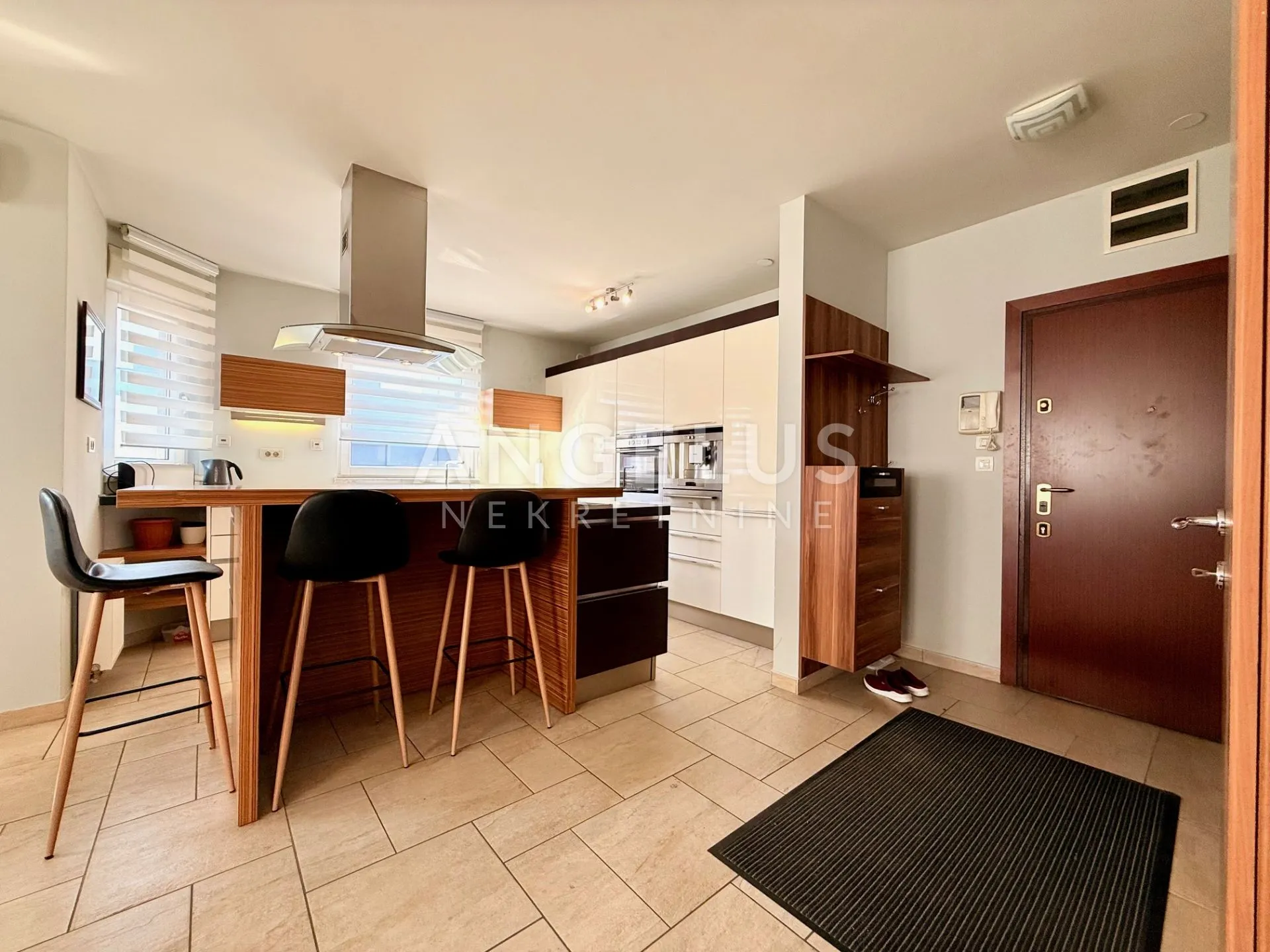 Dvoetažni stan površine cca 86m2 sastoji se od dvije etaže donje i gornje. Na donjoj etaži nalazi se ulazni hodnik iz kojeg je pristup u gotovo sve prostorije u stanu, otvorenog prostora u kojem je velika otvorena kuhinja kompletno namještena i opremljena Siemens i Miele aparatima, blagovaonica i dnevni boravak s izlazom na balkon, vešeraj i kupaonica s tuš kabinom. Na katu se nalazi velika spavaća soba s izlazom na balkon, manja soba i kupaonica sa kadom i tušem.