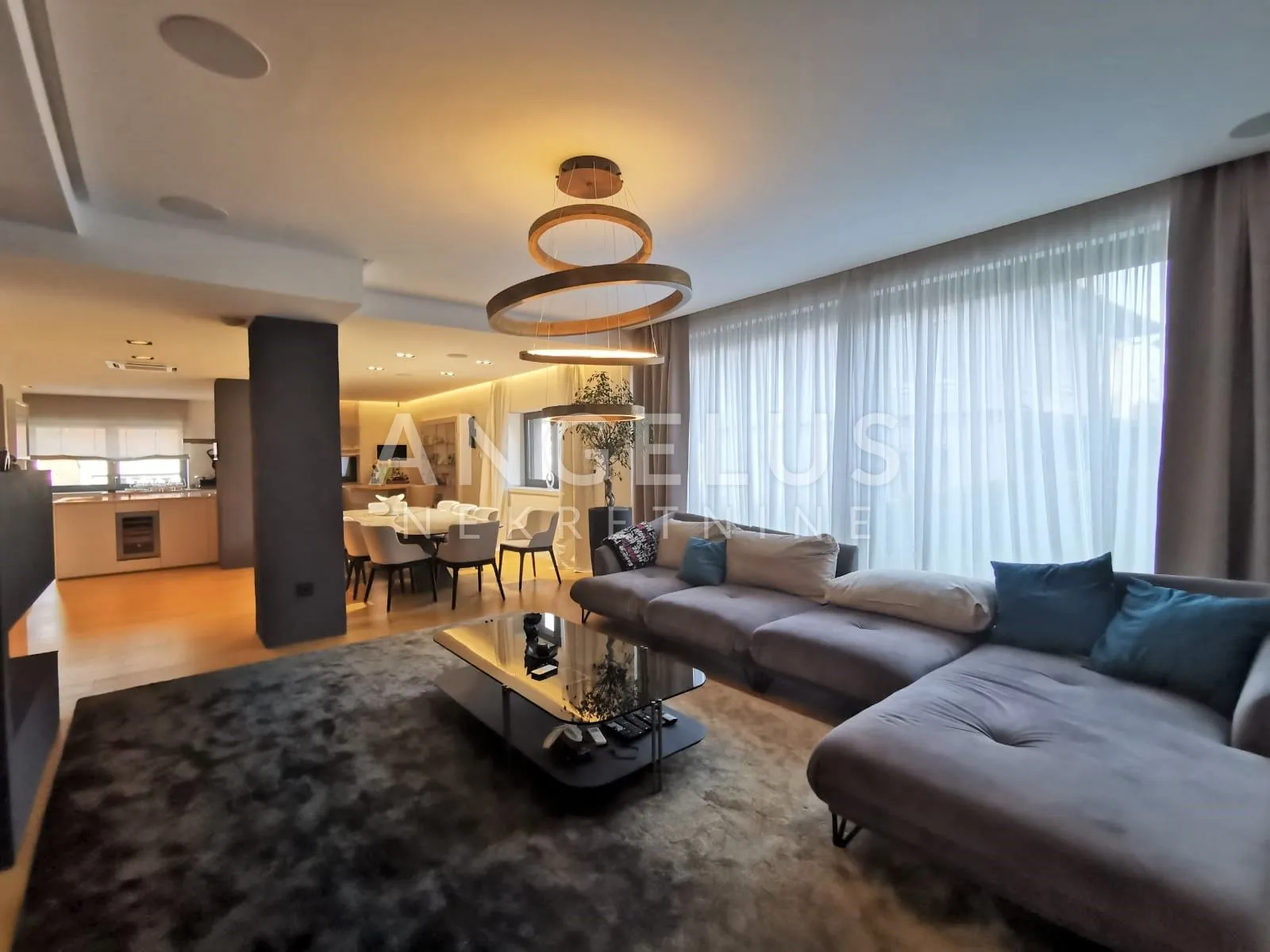 Luksuzna, moderna i dizajnerski uređena vila sa prekrasnim i uređenim dvorištem gdje se nalazi terasa sa vanjskim kaminom i jacuzzijem sastoji se od tri etaže.