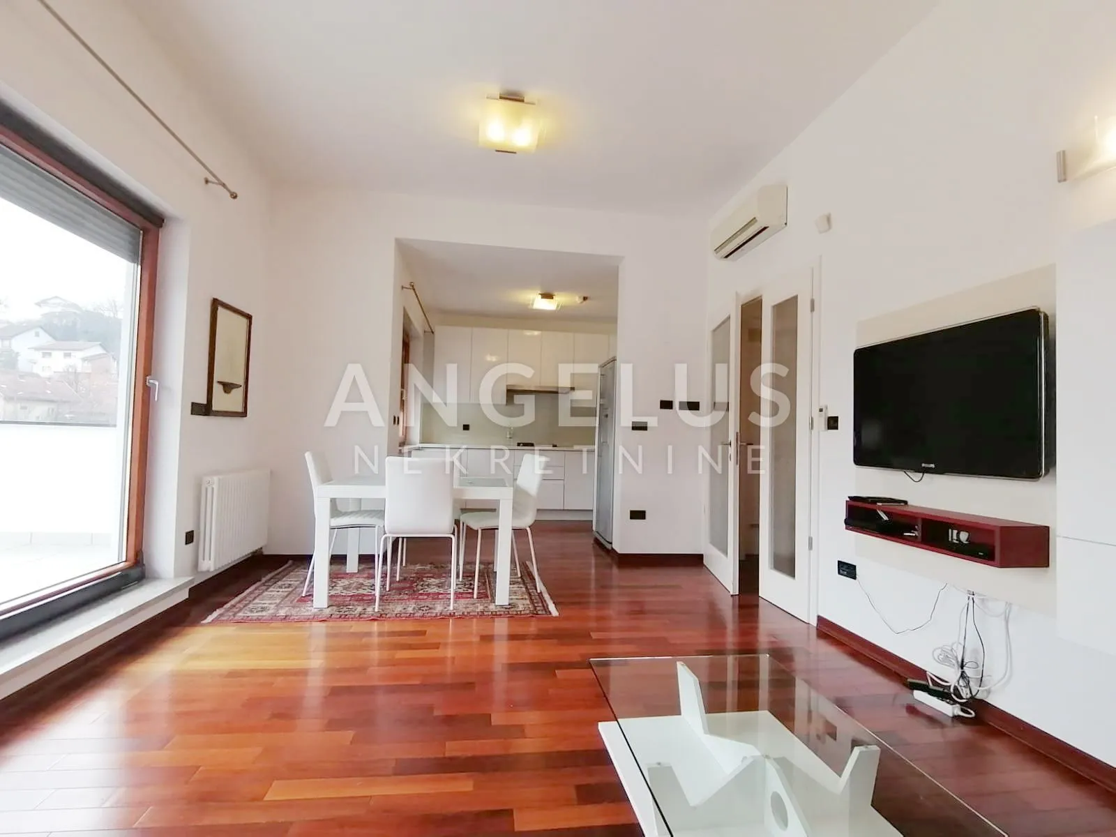 Sastoji se od: ulaznog hodnika, dnevnog boravka sa blagovaonicom i kuhinjom i izlazom na terasu, 2 spavaće sobetoaleta i kupaonice. Potpuno je namješten i ima parkirno mjesto. Centralno etažno grijanje, klimatiziran je. U cijenu najma uključena mogućnost korištenja zajedničke teretane, saune i Jacuzzi-a u podrumu zgrade.