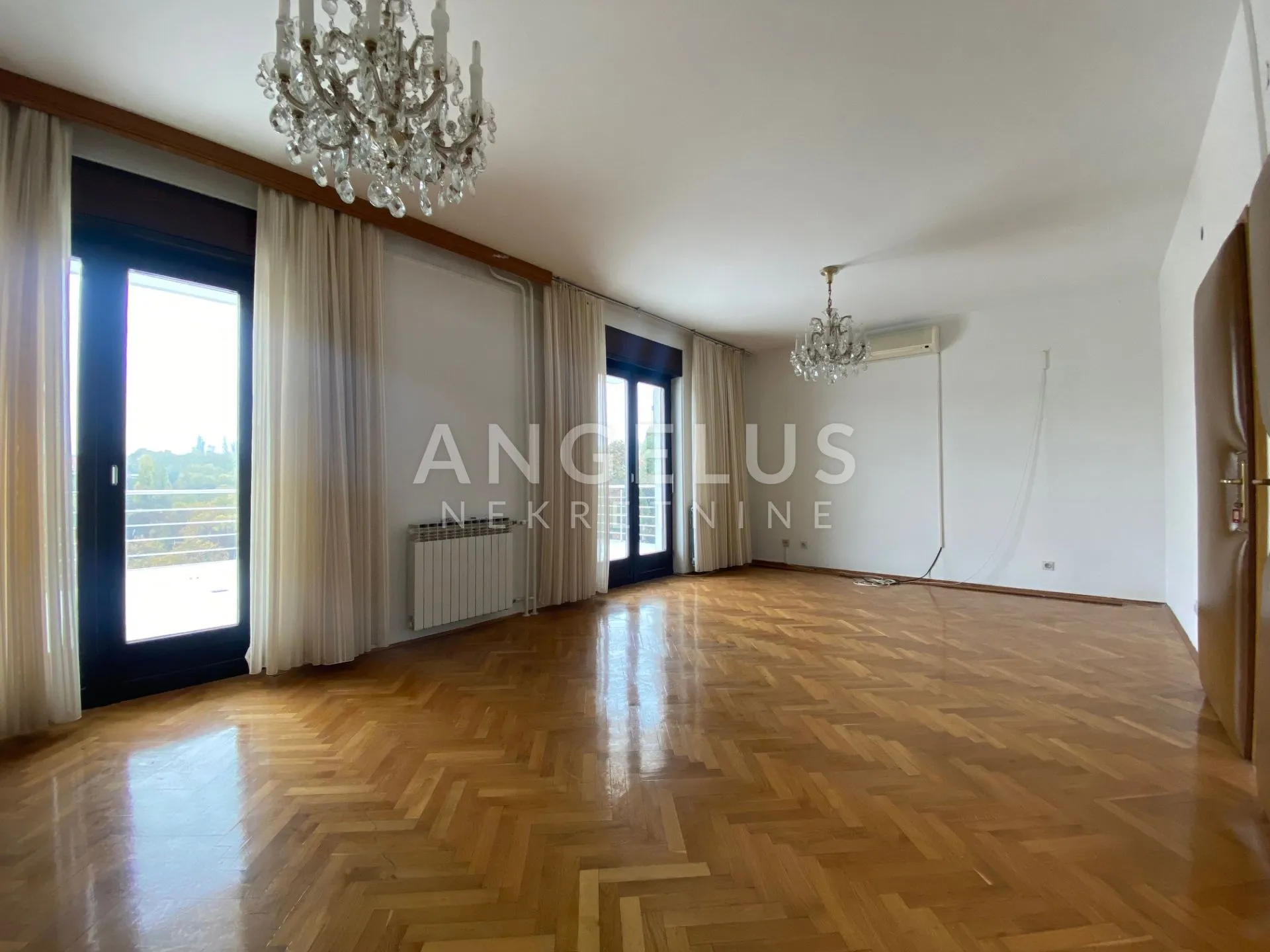 Prostrane, svijetle prostorije, vrhunski drveni parket, kristalni lusteri, terasa popločana bijelim mramorom.