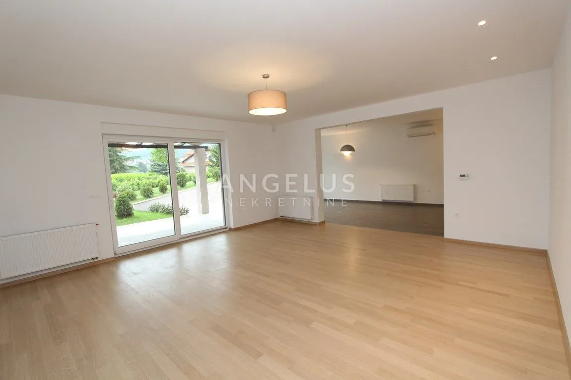 Prizemlje: dupla garaža, praonica, ulazni hodnik sa stubištem, radna soba, kupaonica, Veliki dnevni boravak (36 m2) sa kuhinjom i blagovaonicom(zajedno 45 m2) i izlazom na terasu (60 m2) i vrt. Na katu su 4 spavaće sobe (glavna sa kupaonicom i garderobom, jedna sa svojom kupaonicom, a zadnje dvije dijele jednu kupaonicu) i balkon.
