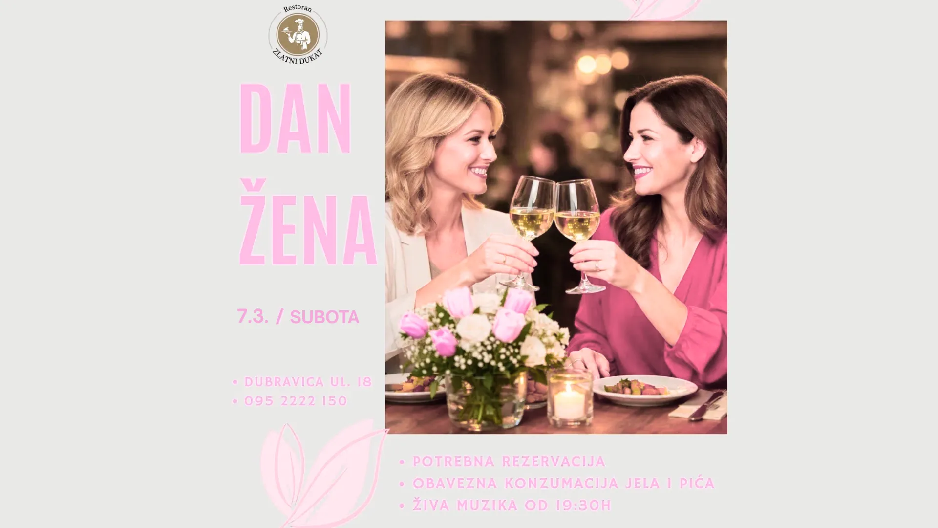 Dan žena 07. 03.Cijena na upit. Potrebna rezervacija Obavezna konzumacija jela i pića Živa muzika od 19:30 Dubravica ul. 18 095 2222 150