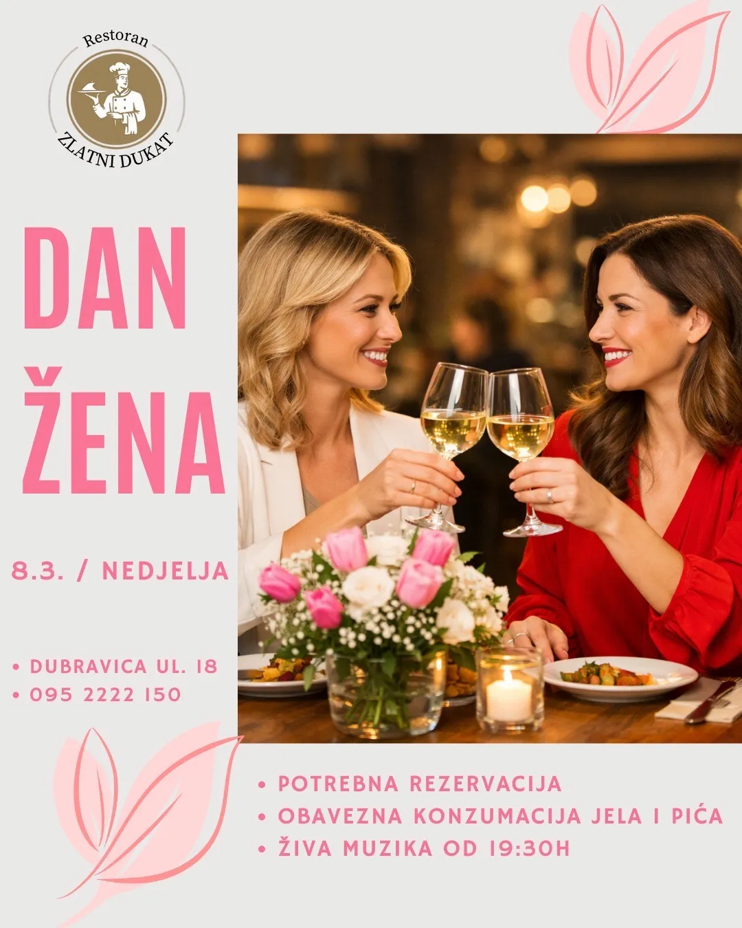 Dan žena 08. 03.Cijena na upit. Potrebna rezervacija Obavezna konzumacija jela i pića Živa muzika od 19:30 Dubravica ul. 18 095 2222 150