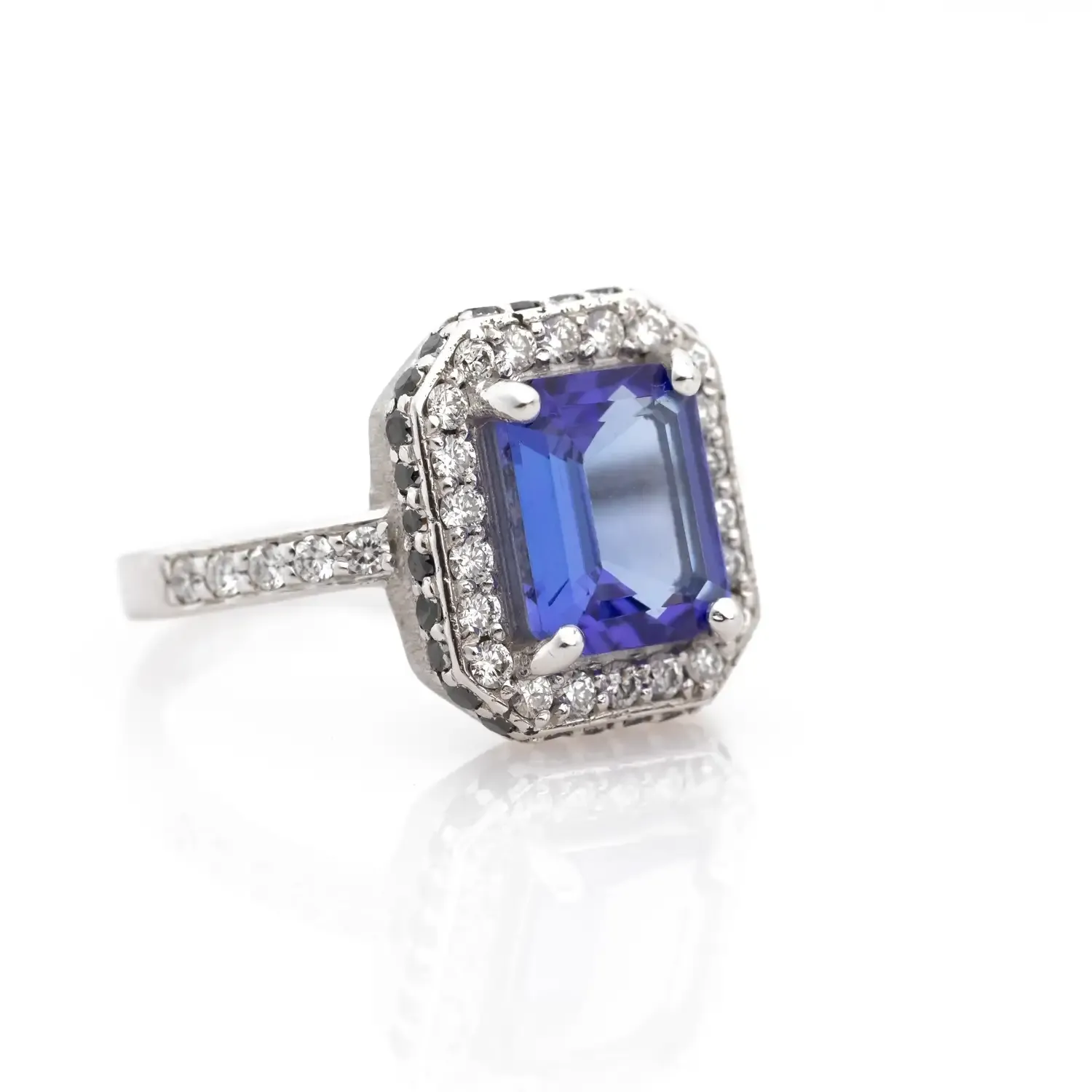 Ženski prsten izrađen od 14ct bijelog zlata sa crnim i bijelim dijamantima i tanzanitom.