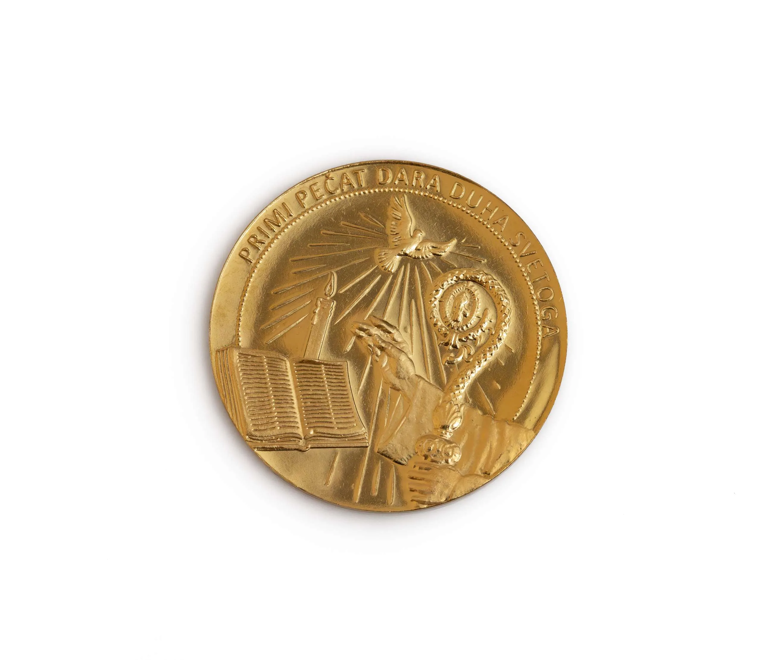 Zlatnik “Primi pečat dara Duha Svetoga” je posebna zlatna kovanica koja se često poklanja prilikom primanja sakramenta potvrde. Ovaj zlatnik simbolizira snagu i prisutnost Duha Svetoga u životu vjernika. Na prednjoj strani često se nalaze simboli Duha Svetoga, poput golubice, dok se na poleđini može naći natpis ili motiv vezan uz potvrdu. Ova kovanica predstavlja važan trenutak duhovnog rasta i jačanja vjere, a služi kao trajna uspomena na primanje dara Duha Svetoga.